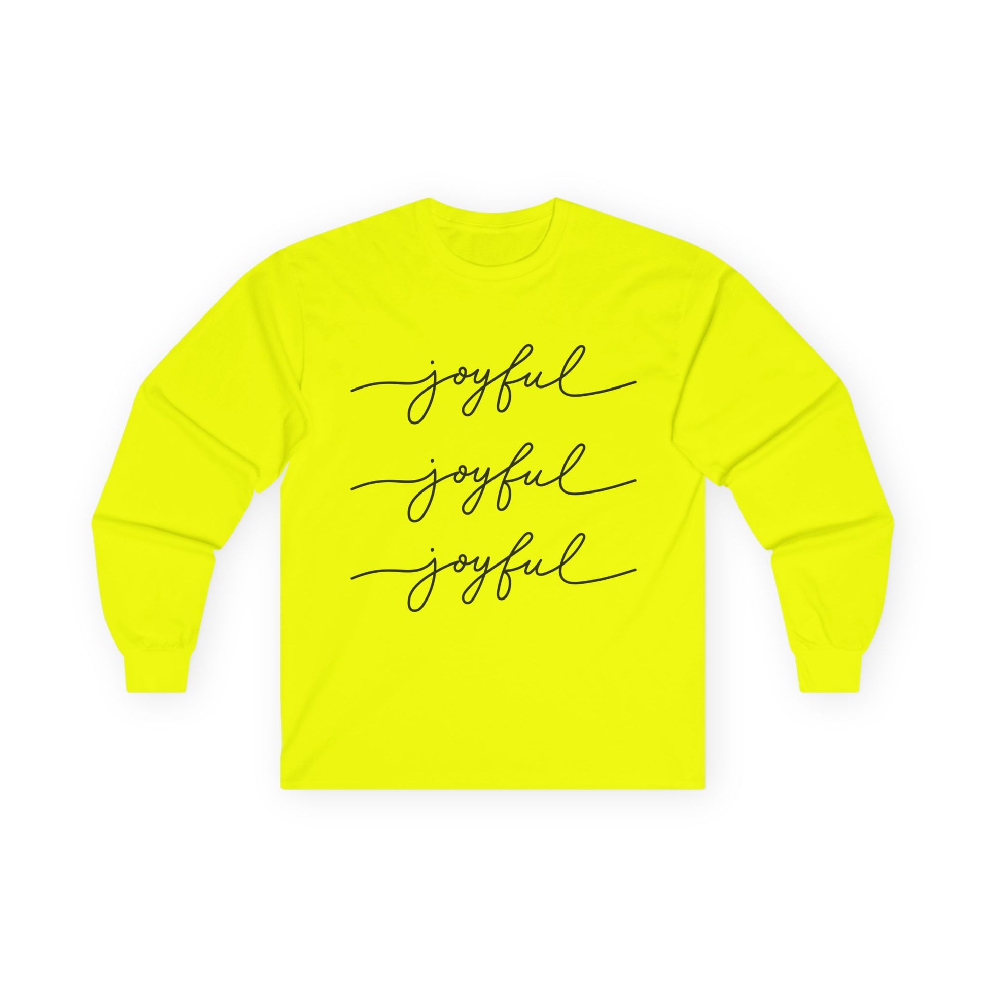Embrace the spirit of joy with this Unisex Ultra Cotton Long Sleeve Tee. The stylish design, featuring a cheerful repeating "joyful" print, adds a touch of positivity to your wardrobe. Wear it on cozy evenings, during celebrations, or simply when you want to brighten your day!